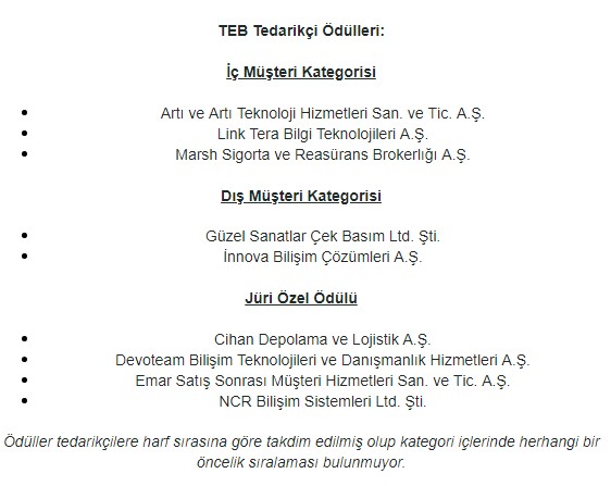 Sunumların ardından, TEB Bankacılık Operasyonları ve Destek Hizmetleri Genel Müdür Yardımcısı Kubilay Güler’in konuşması ile ödül törenine geçildi. Ödüller, TEB Tedarik Direktörü Arda Polat , TEB Mali İşler Genel Müdür Yardımcısı Aşkın Dolaştır ve TEB Bankacılık Operasyonları ve Destek Hizmetleri Genel Müdür Yardımcısı Kubilay Güler tarafından sahiplerine takdim edildi.