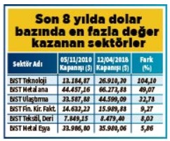 Borsanın dolar bazında zirve yaptığı 2010 yılından bu yana en hızlı yükselen sektör endeksi teknoloji oldu. Teknoloji endeksi dolar bazında yüzde 104 değer kazanarak 13.184 seviyesinden 26.910 seviyesine yükseldi. Sektörde yer alan Logo Yazılım yatırımcısına dolar bazında yüzde 612 kazandırırken Aselsan yüzde 368, Datagate Bilgisayar yüzde 132, Armada Bilgisayar yüzde 112 kazandırdı.