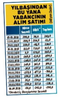 Yabancılar geçen hafta net 298 milyon dolarlık menkul kıymet sattı. Yurt dışında yerleşik kişiler, 6 Nisan haftasında net 56.5 milyon dolarlık hisse senedi, 242 milyon dolarlık Devlet İç Borçlanma Senedi (DİBS) sattı. Son 3 haftadır DİBS’te alıcı olan yabancılar geçen hafta satışa geçti.