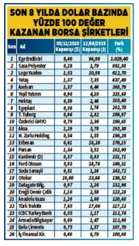 Endekste dolar bazında oluşan bu yüksek değer kaybına rağmen dolar bazında değer kazanan üstelik bu kazançları yüzde 100’ün üzerinde gerçekleşen 26 hisse senedi bulunuyor. Bu hisselerin 13 tanesi BIST 100’de yer alıyor. Dolar bazında en fazla kazandıran sektörler; Teknoloji, Metal Ana ve Ulaştırma sektörleri olurken en fazla kaybettirenler Spor, Elektrik ve Banka oldu.