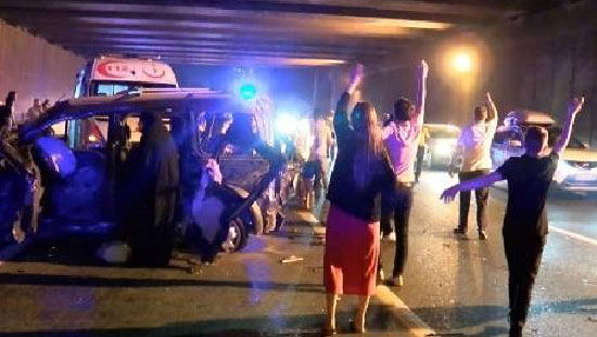 Kaza, TEM Otoyolu Beşiktaş Harp Akademileri tüneli Edirne istikametinde saat 02.00 sıralarında meydana geldi. Edirne istikametinde ilerleyen 33 CNT 40 plakalı otomobile, aynı istikamette giden ve makas atarak ilerlediği iddia edilen 34 RJ 5171 plakalı otomobil çarptı. Çarpmanın etkisiyle savrulan 33 CNT 40 plakalı otomobil bariyerlere vurarak durdu. Kaza sırasında araçlarda bulunan kişiler yola savruldu. Kazaya neden olan 34 RJ 5171 plakalı otomobilin sürücüsünün ise bir süre sonra olay yerinden kaçtığı belirtildi. İhbar üzerine bölgeye çok sayıda sağlık, polis ve itfaiye ekibi sevk edildi. Sağlık görevlilerinin kontrolünde kaza nedeniyle 2 kişinin hayatını kaybettiği, 5'i çocuk olmak üzere 8 kişinin de yaralandığı tespit edildi. Yaralılar ilk müdahalenin ardından ambulansla çevre hastanelere kaldırıldı. Ölen 2 kişinin cansız bedenleri ise incelemelerin ardından morga konuldu. Kazadan geriye, ölen ve yaralanan kişilerin yola savrulan terlik, çanta, valiz ve çeşitli eşyalar kaldı.