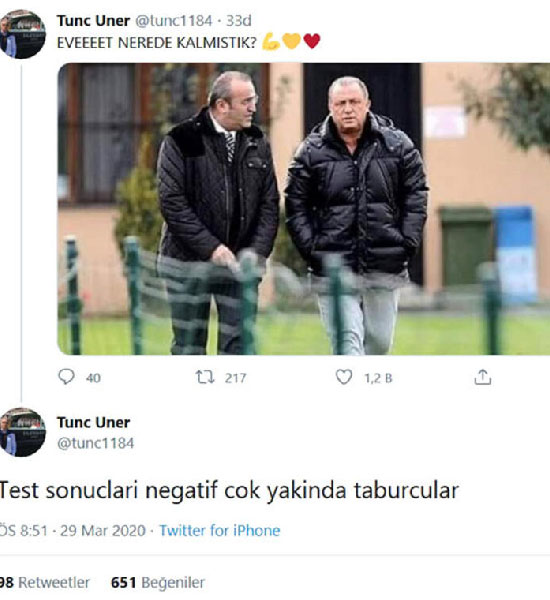 Galatasaray Divan Kurulu Üyesi Tunç Üner, sosyal medya hesabından akşam saatlerinde yaptğı açıklamada Abdurrahim Albayrak ile Fatih Terim'e yapılan son korona virüs testlerinin negatif çıktığını açıkladı. Üner, Terim ve Albayrak'a yakında taburcu olacaklarını söyledi.