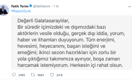 Fatih Terim, Twitter hesabından yaptığı açıklamada şu ifadeleri kullandı: