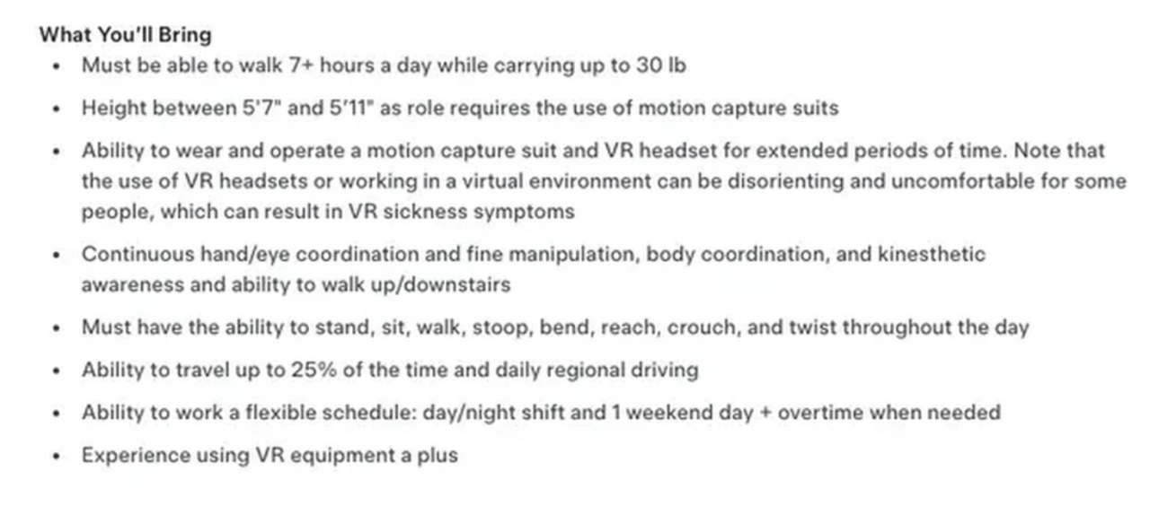 İş sırasında “sürekli el ve göz koordinasyonu, vücut koordinasyonu, kinestetik farkındalık, merdiven çıkma ve inme gibi hareket kabiliyeti" gerekiyor.