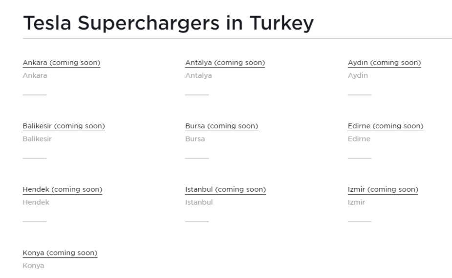 Tesla; Ankara, Antalya, Antalya, Aydin, Balikesir, Bursa, Edirne, Hendek, İstanbul, İzmir ve Konya olmak üzere 11 bölgeye hızlı şarj istasyonları yerleştireceğini duyurdu.