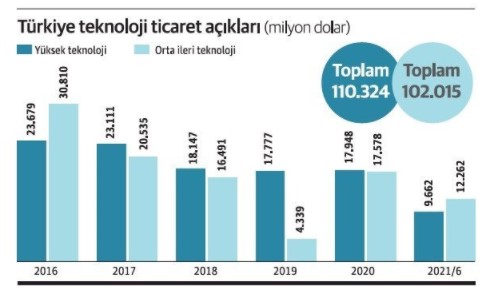 TÜİK verilerinden yapılan hesaplamalara göre, 2021 yılı Ocak-Haziran döneminde yüksek teknolojili ürünlerde 2 milyar 977 milyon dolarlık ihracata karşılık 12 milyar 639 milyon dolarlık ithalat yapıldı ve 9 milyar 662 milyon dolarlık açık verildi. Bu dönemde verilen açık, geçen yılın aynı dönemine göre 1 milyar 537 milyon dolar arttı. Açık miktarı orta yüksek teknolojili ürünlerde daha yüksek oluştu. Bu kategoride 34 milyar 417 milyon dolarlık ihracata karşılık 46 milyar 679 milyon dolarlık ithalatla 12 milyar 262 milyon dolarlık açık verildi.