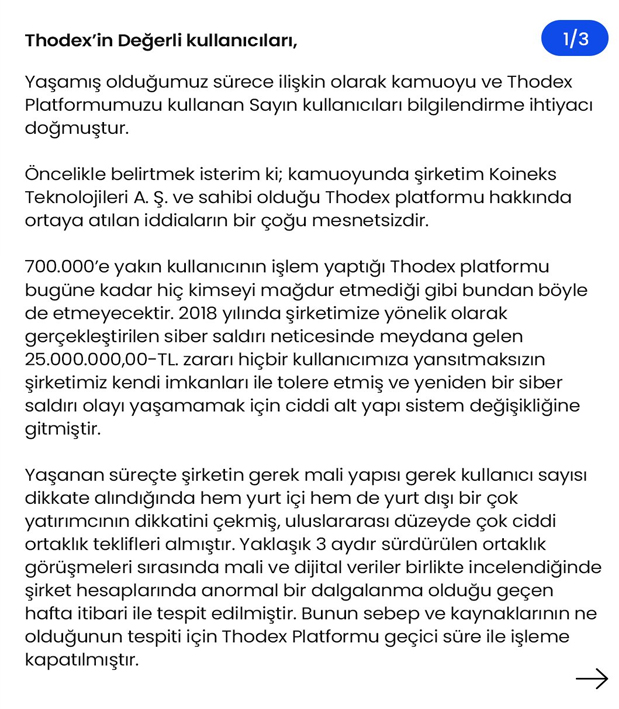 Thodex'ten yapılan açıklamada şu ifadelere yer verildi: "Son 2 yıllık süreçte kripto varlıklara duyulan ilginin artması ve büyük aktörlerin; sektöre dahil olması ile birlikte, borsaların büyümesi ve yeni adımların atması da kaçınılmaz hale gelmiştir. İsmini anlaşma süreci tamamlandığında duyuracağımız; dünya çapında bilinirliği olan banka ve fon şirketleri; uzun süredir şirketimize yatırım yapmak istemekte ve ortaklık teklifinde bulunmaktadır. Sizlere daha iyi hizmet verebilmek adına gelen ortaklık teklifini olumlu değerlendirme kararı alınmıştır. Bu sürecin tamamlanabilmesi için işlemlerin durdurulup; devir sürecinin tamamlanması gerekmektedir. Süreç ise yaklaşık 4-5 iş günü sürecektir. Bu süre zarfında kullanıcılarımıza düzenli olarak bilgilendirme sağlanacaktır.”
