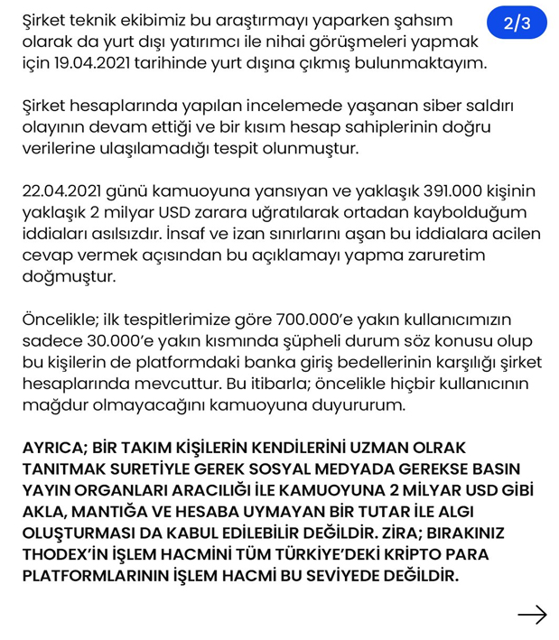 Özer, "Yaklaşık 3 aydır sürdürülen ortaklık görüşmeleri sırasında mali ve dijital veriler birlikte incelendiğinde şirket hesaplarında anormal bir dalgalanma olduğu geçen hafta itibari ile tespit edilmiştir. Bunun sebep ve kaynaklarının ne olduğunun tespiti için Thodex Platformu geçici süre ile işleme kapatılmıştır" dedi.