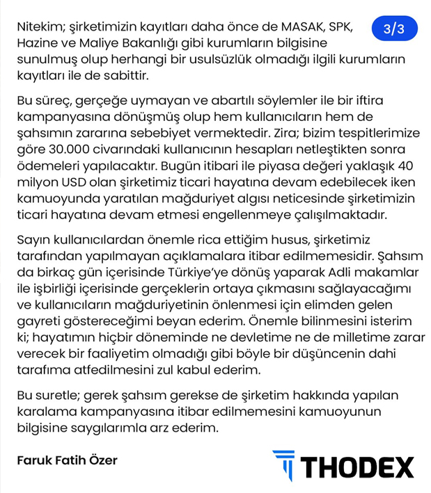 İstanbul Anadolu Cumhuriyet Başsavcılığı da art arda yapılan suç duyuruları üzerine konuyla ilgili soruşturma başlatırken Thodex'in kurucusu ve Yönetim Kurulu Başkanı Faruk Fatih Özer'den ilk açıklama geldi.