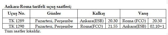7 Ocak 2019 itibarıyla başlayacak Ankara-Roma seferleri haftada 2 frekans (Pazartesi–Perşembe) karşılıklı olarak planlanmış olup sefere ait biletler satışa sunulmuştur.