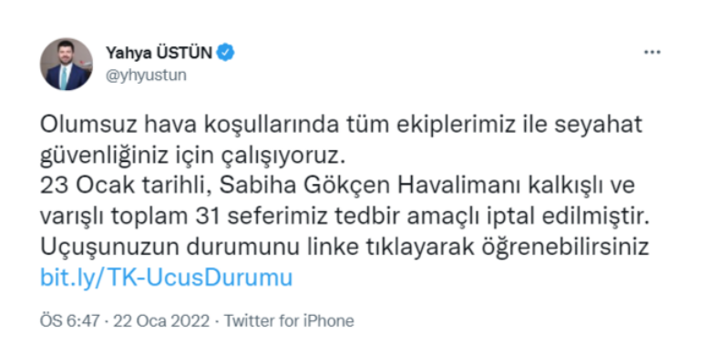 Üstün yaptığı açıklamada, "Olumsuz hava koşullarında tüm ekiplerimiz ile seyahat güvenliğiniz için çalışıyoruz. 23 Ocak tarihli, Sabiha Gökçen Havalimanı kalkışlı ve varışlı toplam 31 seferimiz tedbir amaçlı iptal edilmiştir." ifadelerine yer verdi.(Sabah)