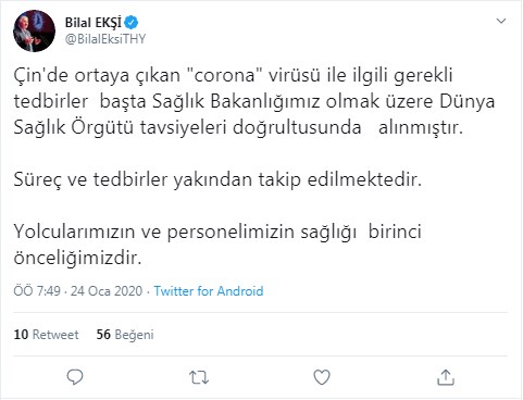 Ekşi twitter hesabından yaptığı açıklamada, "Süreç ve tedbirler yakından takip edilmektedir. Yolcularımızın ve personelimizin sağlığı birinci önceliğimizdir." dedi.