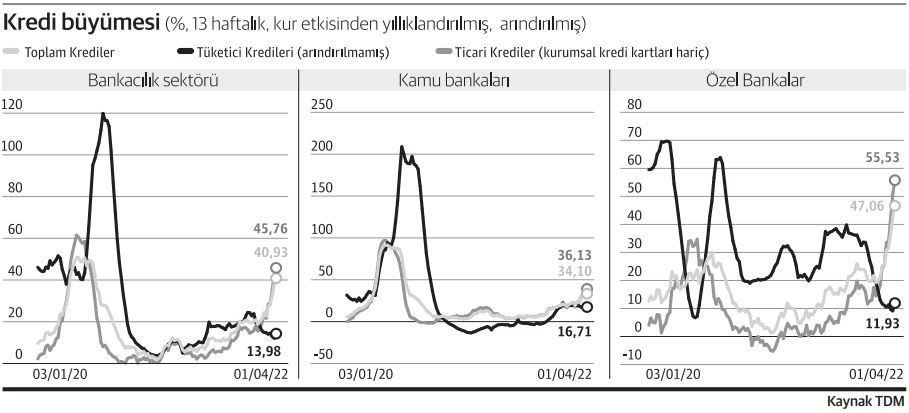 1 Nisan haftasında kamu bankalarında ticari krediler yüzde 36,13 büyürken özel bankalarda büyüme yüzde 55,53 oldu. Kamu bankalarında toplam krediler 2.5 trilyon lira olurken ticari ve diğer krediler ise 2.1 trilyon liraya ulaştı. Yabancı sahipli bankalarda toplam kredi hacmi 1.3 trilyon lirayı aşarken ticari ve diğer kredilerin büyüklüğü 1.1 trilyon liraya geldi. Yerli özel bankalarda da 1.6 trilyon lira olan toplam kredi hacminin 1.2 trilyon lirasını ise ticari ve diğer krediler oluşturdu.