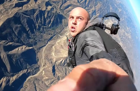 Kalkıştan 35 dakika sonra Los Padres Ulusal Ormanı üzerinde paraşütüyle uçaktan atlayan Jacob, özçekim çubuğuyla iniş anını, uçağa yerleştirdiği kameralarla da uçağın düşüş anını kayıt altına almıştı.