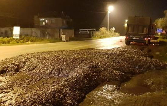 Bursa'nın İznik ilçesinde hamsi yüklü TIR'ın dorsesinin kapağının açılması üzerine tonlarca hamsi otoyola döküldü. Trafiğe kapanan otoyol, dökülen hamsilerin belediye ekiplerince kepçe ile toplanıp, yıkanmasının ardından ulaşıma açıldı.