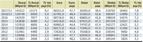 TÜİK verilerinden yapılan derlemeye göre, 2010'da 113.8 milyar dolar olan ihracatın 2 milyar 640 milyon dolarlık kısmı TL cinsinden gerçekleştirilirken, ihracat içinde TL’nin payı yüzde 2.3 olarak hesaplandı. 2011’de 134.9 milyar dolarlık ihracatın yüzde 2.54’üne karşılık gelen 3 milyar 433 milyon dolarlık kısmı TL ile yapıldı. 2012’de 152.4 milyar dolarlık ihracatın 4 milyar 490 milyon doları TL cinsinden olurken, bunun ihracat içindeki payı yüzde 2.94 oldu. 2013’te 5 milyar 356 milyon dolarlık TL cinsinden ihracatın 151.8 milyar dolarlık toplam ihracat içindeki payı yüzde 3.52’ye çıktı. 2014’te 157.6 milyar dolarlık ihracatın yüzde 4.24’ü olan 6 milyar 695 milyon dolarlık kısmı TL ile gerçekleştirilirken, 2015’te 143.8 milyar dolarlık ihracatta TL’nin payı 6 milyar 90 milyon dolar ile yüzde 4.25’e yükseldi. 2016 yılında ise 7 milyar 877 milyon dolarlık TL cinsinden ihracat, toplam 142.5 milyar dolarlık ihracat içinde yüzde 5.52 pay aldı. Geride bıraktığımız 2017’de ise 11 aylık dönemde 143.2 milyar dolarlık ihracatın yüzde 9.19’una karşılık gelen 13 milyar 173 milyon dolarlık kısmı TL cinsinden yapıldı.