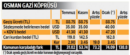 En sıcak örnek Osman Gazi Köprüsü’nün iş ve sözleşme modeli. Dolara endeksli; hem ABD’deki enflasyona göre, hem de doların TL’nin değerine göre artıyor. Osman Gazi Köprüsü geçiş ücreti malum 88.75 TL olarak belirlenmişti. Oysa sözleşmeye göre işletmeciye kamu kasasından taahhüt edilen ödeme 35 dolar üzerinden. Temmuz itibariyle bu bedelin TL karşılığı 120 TL idi. Yani, 40 binlik geçiş garantisi çerçevesinde, kamu kesesinden çıkacak olan; geçmeyen her araç için 120 TL, geçen için de 31 TL fark demekti. Dolar kuru 2.90’dan 3.45’e gelince, ödenecek bedel 142.5 TL’ye, işletmeciye ödenecek fark da 53 TL’ye çıktı. Özetle; kur yüzde 19 artarken, devletin cebinden çıkacak fark yüzde 73 artmış oldu. Yılbaşında sözleşmeye göre ödeme kabaca 40 dolara çıktığında da, geçiş ücreti 88.75 TL’de kaldığı sürece; geçenlerin ücret farkı olarak ilave 74 TL, geçmeyenler için de 162 TL ödeme yapılacak. İşte dövizle yapılan YİD projesinden vergi mükelleflerinin cebinden çıkacak para bu; her geçen için, bir geçiş ücreti kadar bedel. 200 TL’ye koşan bu ücret de, öngörülen geçiş sayılarını sağlayacak makul ve rasyonel bir geçiş bedeli değil. En başından ne kadar hesapsız bir proje olduğunun da göstergesi.