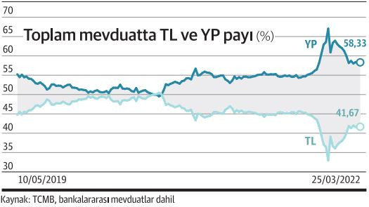 Döviz talebini azaltmak ve kurdaki yükselişi kontrol altına alabilmek için devreye sokular kur korumalı TL mevduat ürününün ardından toplam mevduat içinde TL mevduatın payı dibi gördüğü 17 Aralık 2021 haftasından 25 Mart 2022 haftasına kadar 8.73 puan arttı. TL mevduatın payı yüzde 32,93 seviyesinden 41,66’ya yükselirken, yabancı para mevduatın payı da 17 Aralık haftasındaki yüzde 67,06 seviyesinden yüzde 58,33’e indi.