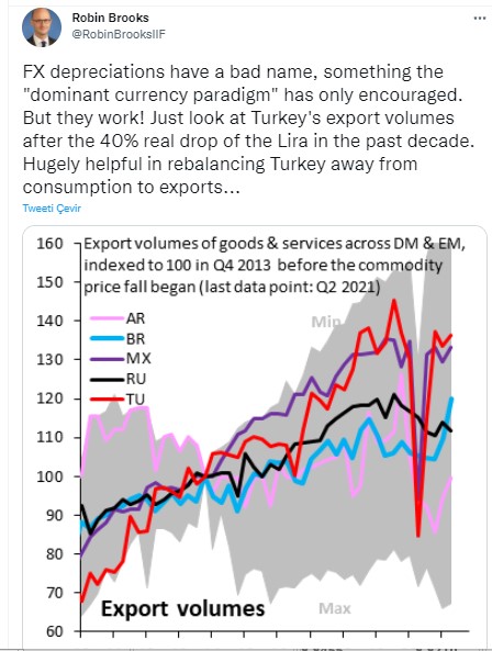 Uluslararası Finans Enstitüsü (IIF) Baş Ekonomisti Robin Brooks, TL'de son 10 yılda yaşanan değer kaybının Türkiye ekonomisinin dengelenmesine katkı yaptığını belirtti.