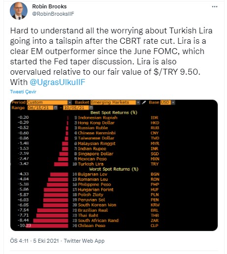 Brooks ayrıca, TCMB'nin faiz indiriminden sonra TL’de değer kaybı konusunda endişeleri anlamakta zorlandığını belirtirken, Fed'in daralma (varlık alım azaltımı) tartışmasının başladığı Haziran ayında FOMC toplantısında bu yana açık gelişmekte olan ülke para birimleri arasındaki performansına dikkat çekti. TL’de 9,50 seviyesi beklentilerini yineledi.