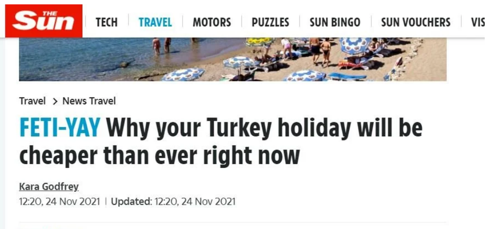 Gazete, “Türkiye tatiliniz şu an daha önce hiç olmadığı kadar ucuz olacak. Tatilciler şu an Türkiye tatili rezervasyonu yapmalı çünkü bu yıllardır olmadığı kadar ucuz olacak. Türk Lirası, Cumhurbaşkanı Erdoğan’ın faiz indirimi ile ilgili açıklamalarından sonra rekor seviyelere düştü. Bu da İngilizlerin poundlarıyla daha çok TL alabileceği anlamına geliyor” yorumunu yaptı.