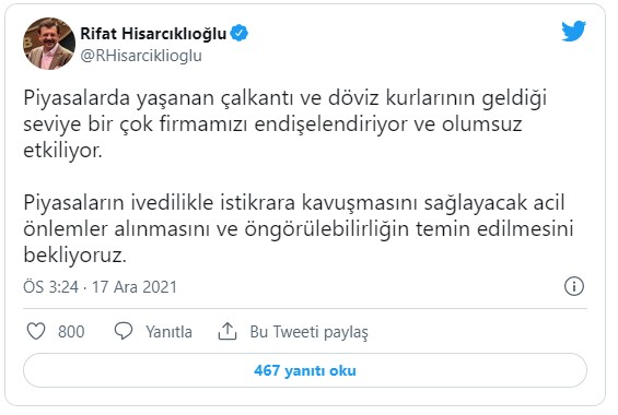 Hisarcıklıoğlu, Twitter hesabından yaptığı açıklamada, "Piyasalarda yaşanan çalkantı ve döviz kurlarının geldiği seviye bir çok firmamızı endişelendiriyor ve olumsuz etkiliyor. Piyasaların ivedilikle istikrara kavuşmasını sağlayacak acil önlemler alınmasını ve öngörülebilirliğin temin edilmesini bekliyoruz" ifadelerini kullandı.