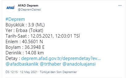 AFAD'ın verilerine göre, Tokat'ın Erbaa ilçesi merkezli 3,9 büyüklüğünde deprem meydana geldi.