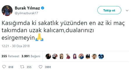 Trabzonspor'un golcü oyuncusu Burak Yılmaz, Twitter hesabından yaptığı açıklamada, "Kasığımdaki sakatlık yüzünden en az iki 2 maç takımdan uzak kalacağım. Dualarınızı esirgemeyin" ifadesini kullandı.