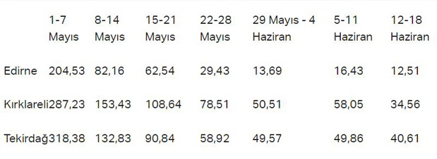 Trakya'daki son haftalarda vaka sayıları değişimi şöyle gerçekleşti:
