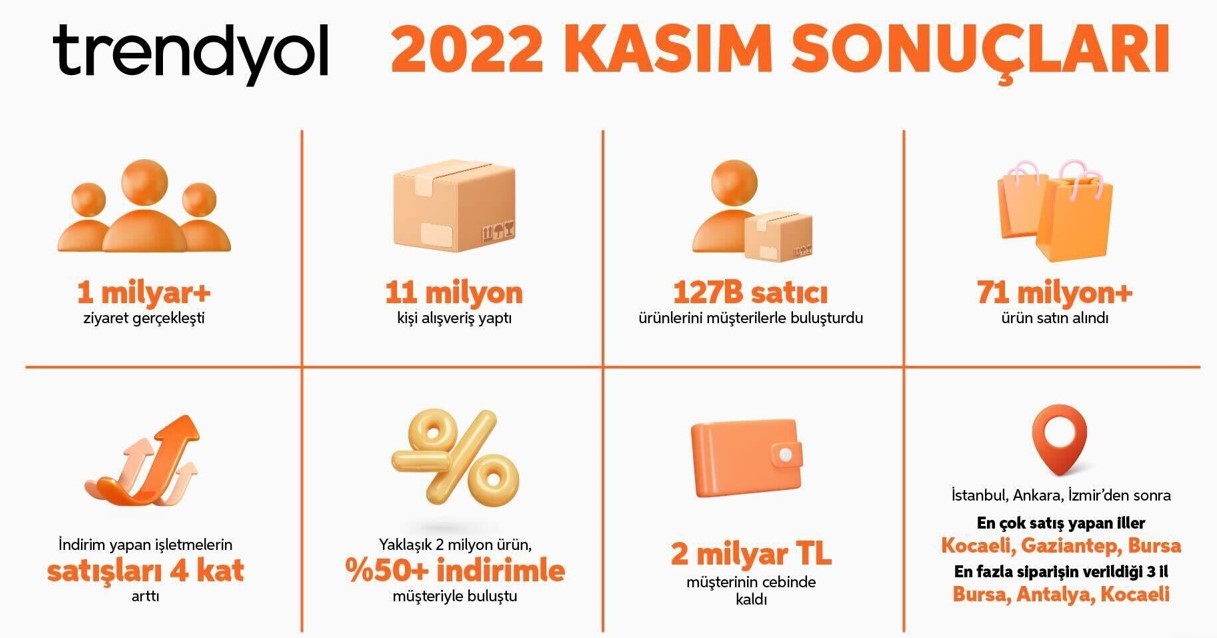 Trendyol bu yıl da, müşterilerinin istedikleri ürünlerdeki indirimlerden hızlı haberdar olması için "favorileme" özelliğini kullandı. Kasım kampanyaları indirimleri ile toplam 2 milyar lira müşterilerin cebinde kaldı. Kasım kampanyalarında bin 42 kadın girişimci de ilk kez satış yaparak, ekonomiye katkı sağlarken, kasım ayı süresince Trendyol’da satış yapan kadın girişimci sayısı 11 bini geçti.