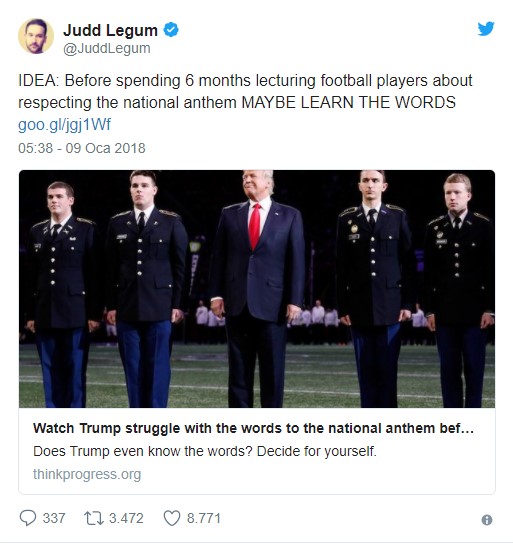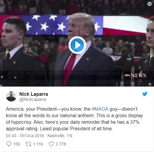 Bir kullanıcı "Amerika, Başkan'ınız ulusal marşımızın sözlerini bilmiyor. Bu iki yüzlülüğün iğrenç bir görünümü. Ayrıca size onun yüzde 37 halk desteği oranına sahip olduğunu hatırlatırım. Tüm zamanların en düşük popülariteye sahip Başkan'ı" yorumunu yaptı.
