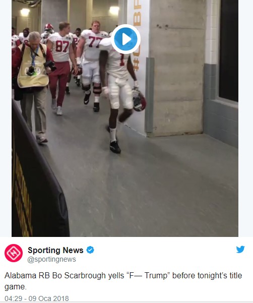 Alabama Crimson Tide oyuncularından Bo Scarbrough da sahaya çıkmadan önce koridorda yürüken duyulacak şekilde "Trump'ı s…." diye bağırdı.