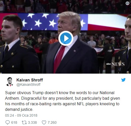 Ardından karşılaşma öncesi sıra ABD ulusal marşını okumaya geldi. Ancak sosyal medya kullanıcıları Trump'ın marşın sözlerini söylemekte zorlandığını fark etti.