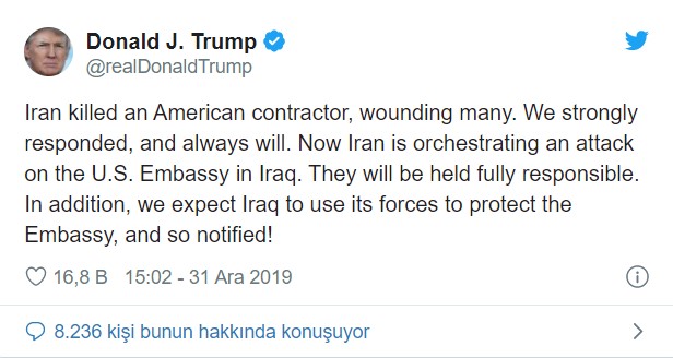 "İran, Amerikalı bir müteahhiti öldürdü ve birçok kişiyi yaraladı. Güçlü bir biçimde karşılık verdik ve vermeye devam edeceğiz. İran şimdi de Irak'taki ABD Büyükelçiliğine yapılan saldırıyı yönetiyor. Tamamen sorumlu tutulacaklar. Buna ek olarak, Irak'tan büyükelçiliğimizi koruması için gücünü kullanmasını bekliyoruz"