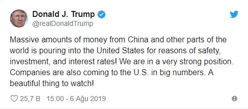 ABD Başkanı Donald Trump, Twitter iletisinde ABD'ye Çin ve dünyanın diğer kısımlarından güvenlik, yatırım ve faizler gibi nedenlerden dolayı çok miktarda para girişi olduğunu söyledi.