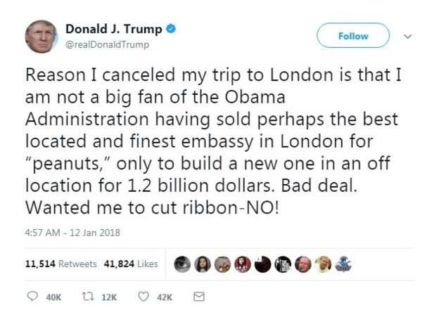 Donald Trump daha önce bir tweetinde gösterişli Mayfair semtinden Londra'nın güneyine taşınan yeni büyükelçilik binasından pek hoşlanmadığını belli etmiş, "Kötü bir alışveriş" ifadesini kullanmıştı.