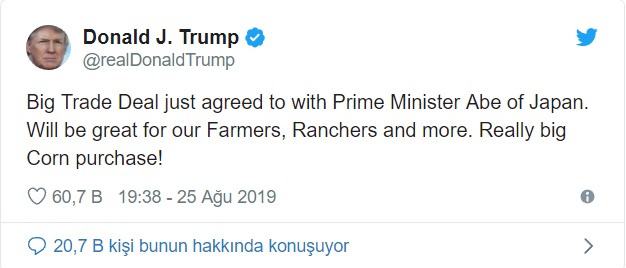 Trump Abe’nin ABD’den mısır alımını taahhüt ettiğini söyledi. Abe ise “potansiyel” mısır alımına yönelik, bu tarz alımların özel sektör tarafından gerçekleştirileceğini belirtti.