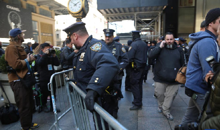 New York Polis Departmanında (NYPD) bütün memurlar, rütbesine bakılmaksızın dünden itibaren göreve çağırılırken, Manhattan ceza mahkemesi, Bölge Savcılığı Ofisi ve Manhattan 5. Cadde'de bulunan Trump Tower önü polis bariyerleri ile çevrildi.