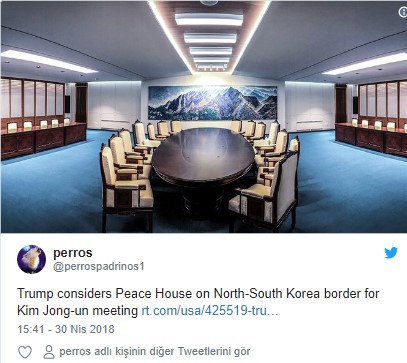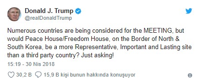 ''Görüşme için birçok ülke değerlendiriliyor, ama üçüncü taraf olacak bir ülkeden ziyade, Kuzey-Güney Kore sınırındaki Barış Evi/Özgürlük Evi daha Temsil Edici, Önemli ve Kalıcı bir mekan olmaz mı? Sadece soruyorum!''