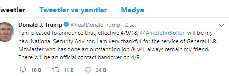 McMaster'ın yerine atanacak Bolton ise 2005-2006 döneminde ABD'nin BM Daimi Temsilcisi olarak görev yapmıştı.