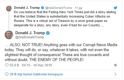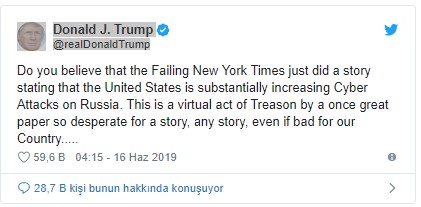 Haberini eski ve görevdeki hükümet yetkilileriyle görüşmelerine dayandıran NYT'nin, Moskova'nın ABD seçimlerine müdahale ettiği iddialarına misilleme olarak Rusya’nın elektrik santrallerine ve ülkedeki diğer hedeflere gizli Amerikan bilgisayar kodlarının gönderildiğini yazmasının ardından Trump yine Twitter'a sarıldı.