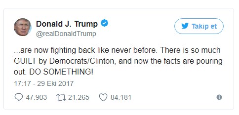 Trump, bütün bu iddiaların ortasında Rusya soruşturmasını 'cadı avı' olarak nitelendirdi, Clinton ve Demokrat Parti'nin suçluluk psikolojisiyle bu konuyu dile getirdiğini aktardı.