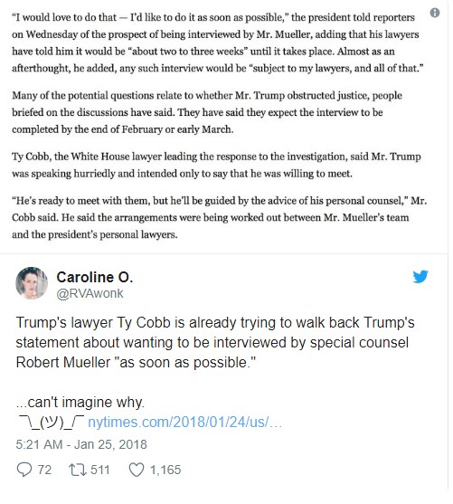 Trump, gazetecilerin, "Mueller'e ifade verecek minisiz?" sorusuna şu yanıtı verdi: "Ben de gerçekten ifade vermeyi dört gözle bekliyorum. Hiç bir sorun, hiç bir engel yok. Benim esas endişem siz gazetecilerin olanları doğru aktarmanız. Dün söylediğim gibi, artık olup biteni anlayıp, doğru bir şekilde anlatmanızın zamanı geldi."