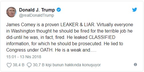 ABD Başkanı Donald Trump, eski FBI direktörü James Comey'in yeni kitabında yer alan iddialara cevap verdi. Trump, "James Comey kanıtlı bir 'sızdırıcı' ve yalancı. Washinton'da hemen hemen herkes onun kovulana kadar yaptıkları nedeniyle kovulması gerektiğini düşünüyordu. Gizli bir bilgi sızdırdı ve bu nedenle soruşturulmalı" ifadesini kullandı.