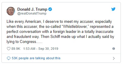 ABD Başkanı Trump, Twitter’dan yaptığı açıklamada şu ifadeleri kullandı: “Her Amerikan gibi, ben de suçlayıcımla tanışmayı hak ediyorum; özellikle bu suçlayıcı-sözde ihbarcı- yabancı bir lider ile harika bir konuşmayı tamamen yanlış ve sahtekar bir biçimde gösterdiği zaman.” Donald Trump bu kişinin “yalanlarının bu mecliste belki de en küstah ve fesat davranış” olduğunu söyledi.