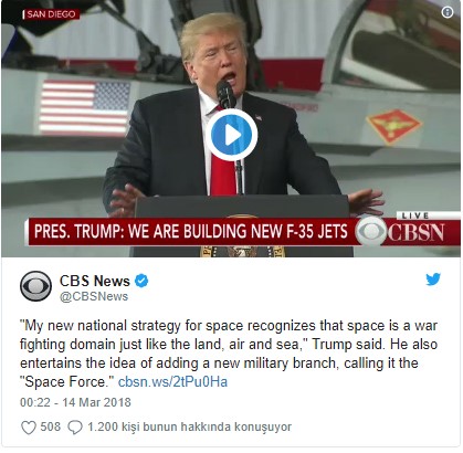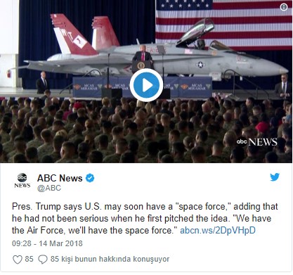 Trump "Benim uzay konusundaki yeni ulusal stratejim uzayı tıpkı kara, deniz ve hava gibi bir savaş alanı olarak tanıyor. Bir Uzay Kuvvetleri'ne sahip olabiliriz. Hava Kuvvetlerimiz var, Uzay Kuvvetlerimiz de olacak. Ordumuz, donanmamız var" ifadelerini kullandı.