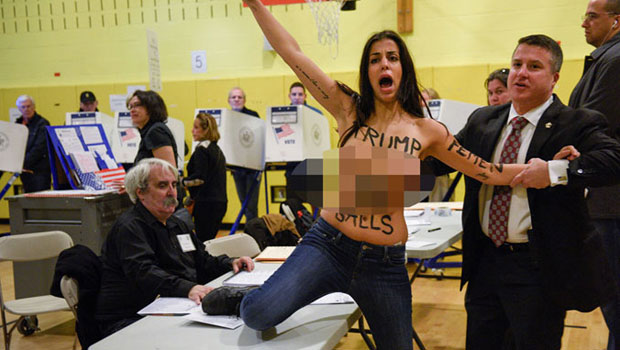 Kadın hakları örgütü FEMEN’in birkaç üyesi Trump’ın adaylığını protesto etmek için seçim merkezini bastı.