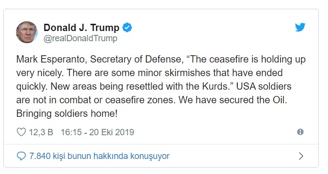 Suriye ile ilgili yeni paylaşım yapan Trump, bu sefer "Mark Esper" adına atıf yaparak, "Ateşkes çok iyi gidiyor. Çabuk sona eren bazı ufak çatışmalar var. Kürtler yeni bölgelere yerleştiriliyor. ABD askerleri, çatışma ya da ateşkes bölgelerinde bulunmuyor. Petrolün güvenliğini sağladık." ifadelerini kullandı.