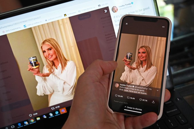 Twitter hesabında tıpkı başkan babası gibi Goya markasının reklamını yapan Ivanka, elinde Goya marka konserve tutarak poz verdi. Fotoğrafa "Eğer Goya ise mutlaka iyidir" mesajını eklemeyi ihmal etmedi. Bu sözü Goya İspanyol kökenli şirket olduğu için İspanyolca da yazdı.