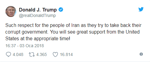 Trump, tweetinde "Yozlaşmış hükümetlerini geri almaya çalışan İran halkına büyük bir saygı duyuyorum. Zamanı gelinde ABD'den büyük bir destek göreceksiniz" ifadesini kullandı.